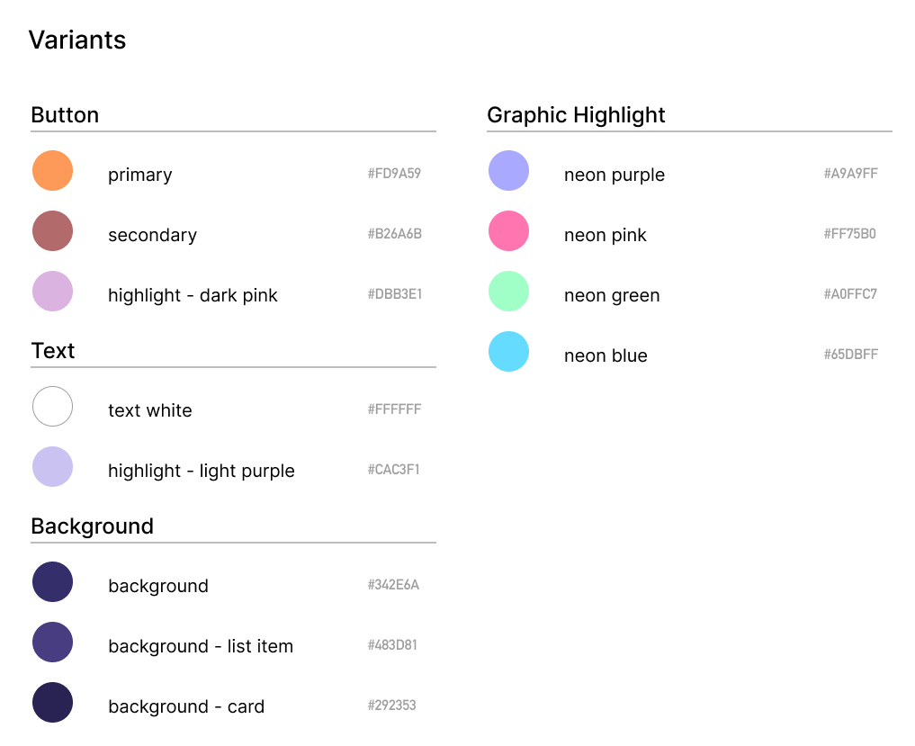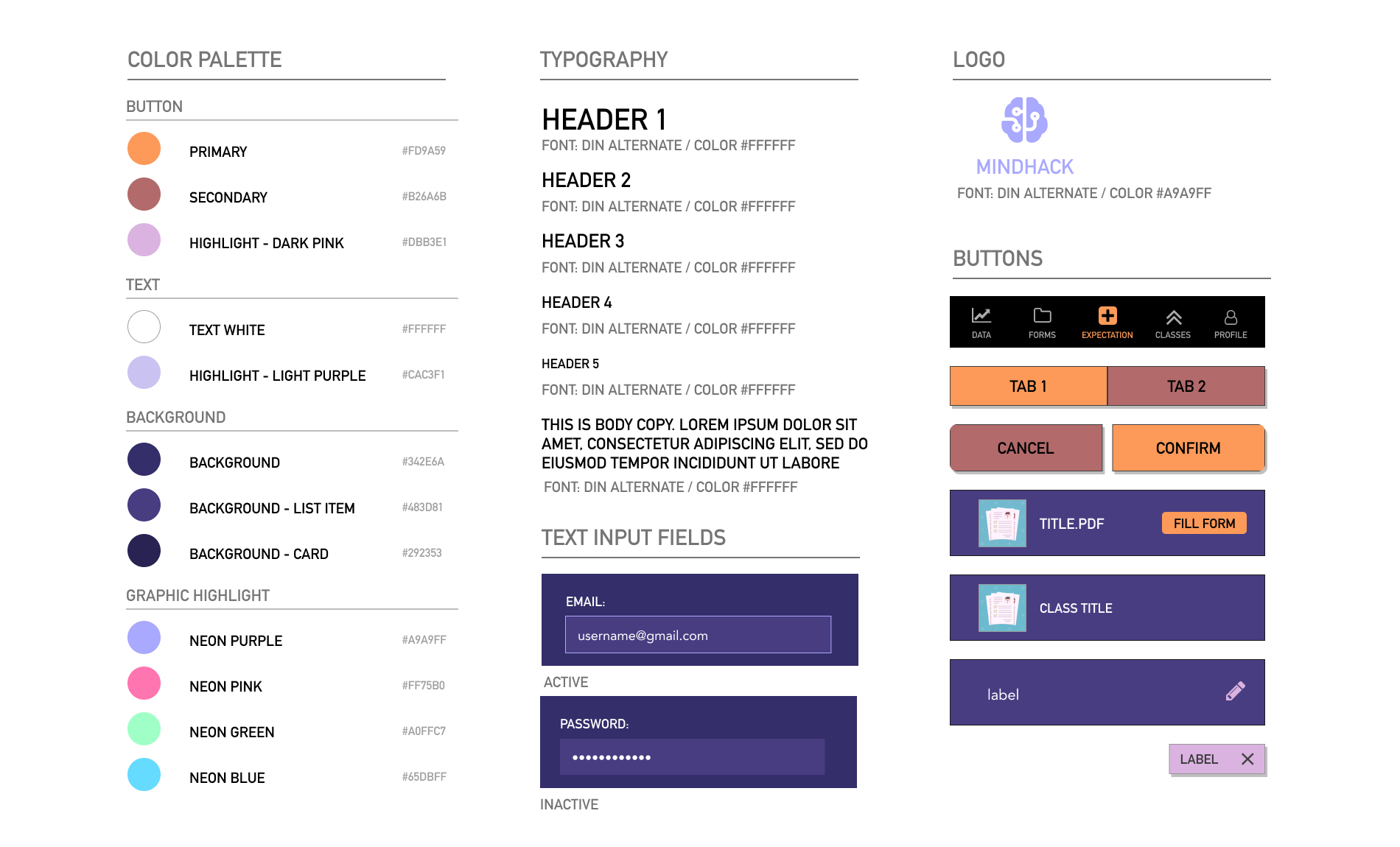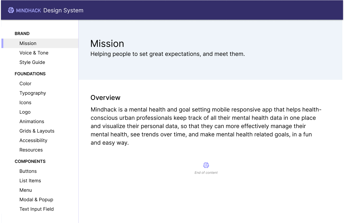 I developed an extensive design system and style guide for the Mindhack app, based on researching several industry-standard models, and organized app elements into high-level categories including Brand, Foundations, and Components within a fully interactive Figma prototype.