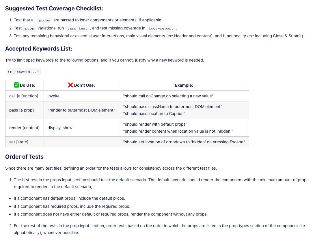 New standards are developed on the Design System team on a regular basis. For example, in the process of converting from the usage of the Jest unit test library Enzyme to React Testing Library, we had to define new standards including accepted spec keywords and ordering of tests. These standards developed organically during the process of code review, were agreed upon by the team and added to Storybook documentation, shared with the developer teams at large during the collective dev huddle the following week, and standards were enforced afterwards in later code reviews.